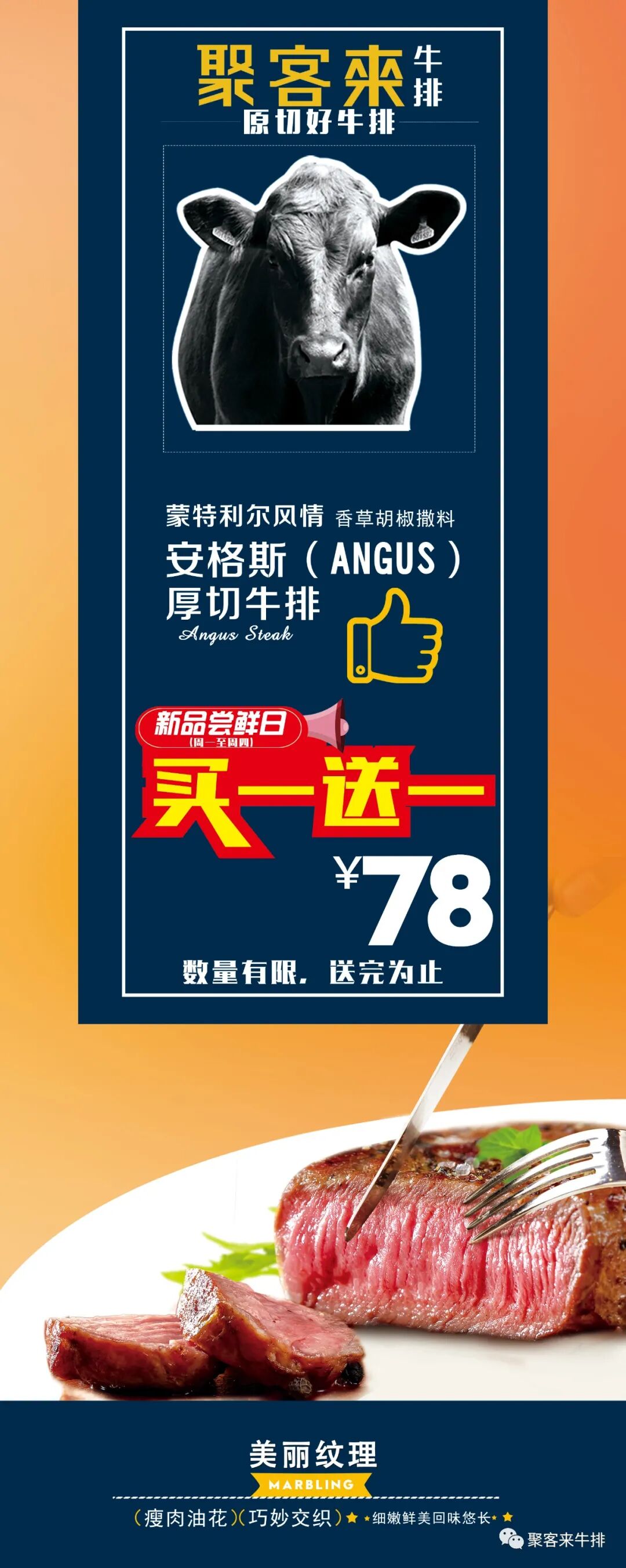 聚客来牛排新品尝鲜日,周一至周四,安格斯牛排买一送一