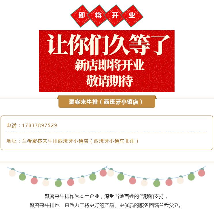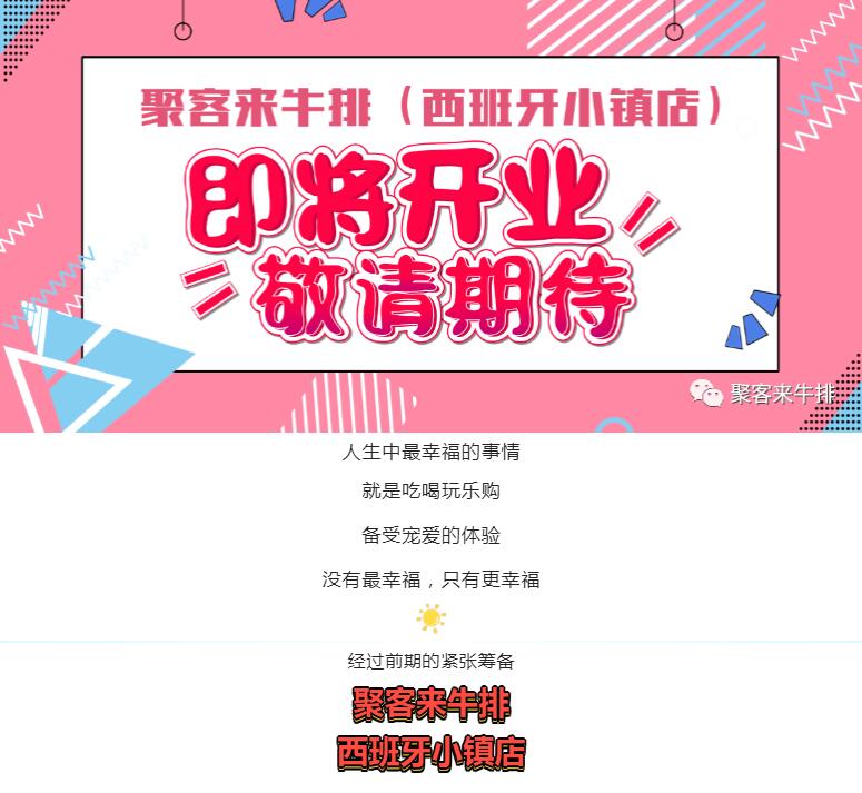 【聚客来牛排西班牙小镇店】即将开业,礼惠全城,敬请期待......